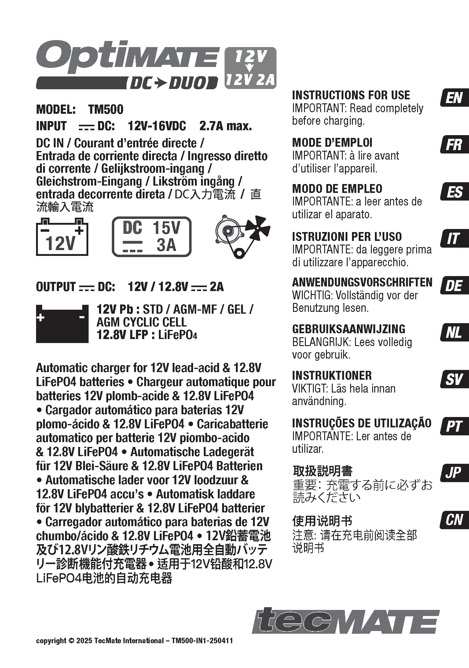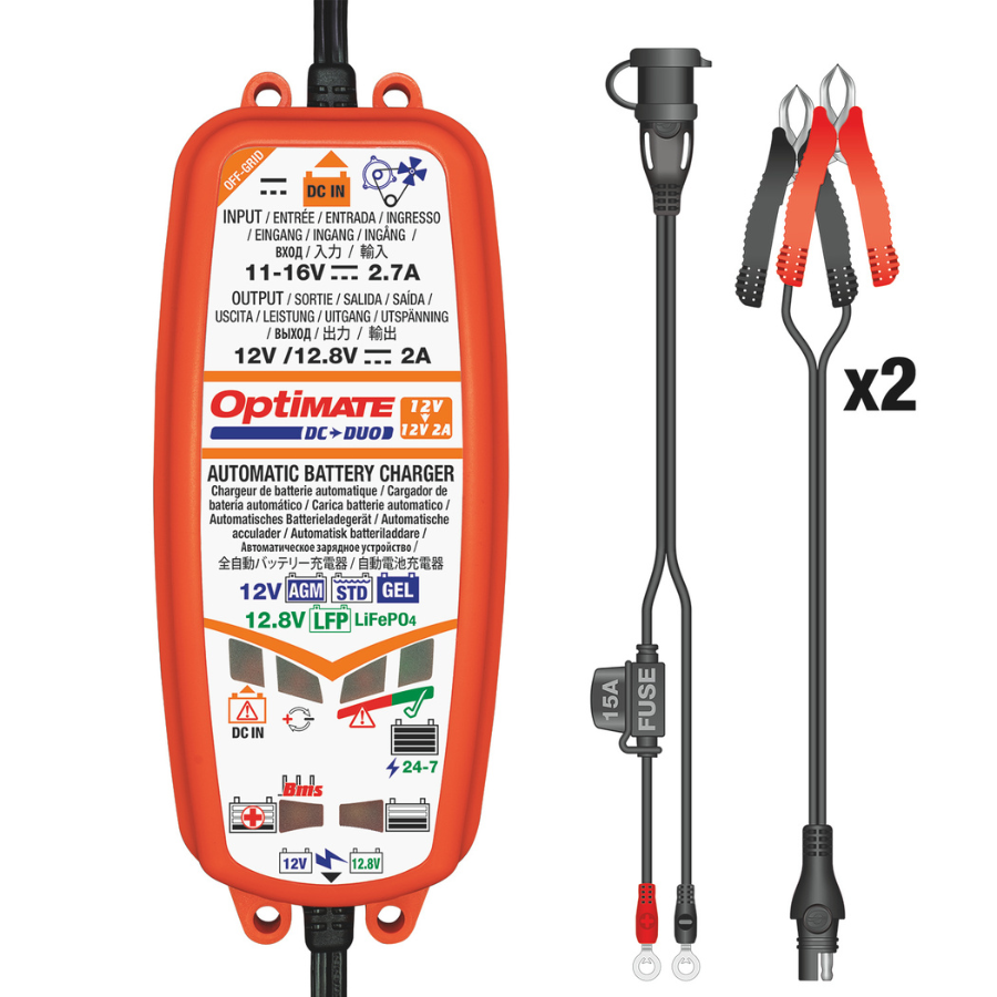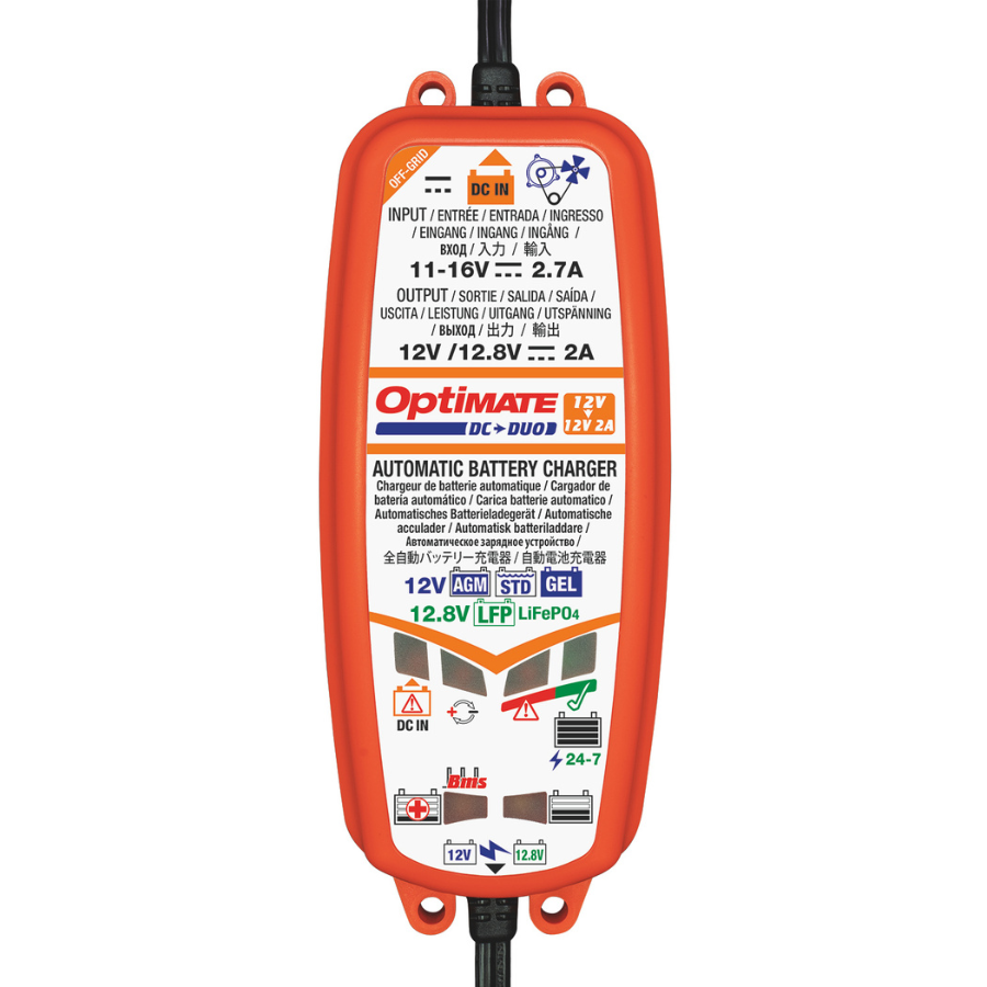 OptiMate DC-DC 12V 2A充電器は、別の12V電池から電力を引き出し、AC100V電源無しで12V鉛蓄電池または12.8V LifePO4/LFPリチウムバッテリーを充電する充電器およびバッテリーメンテナーです。 – AC100V電源は必要ありません!